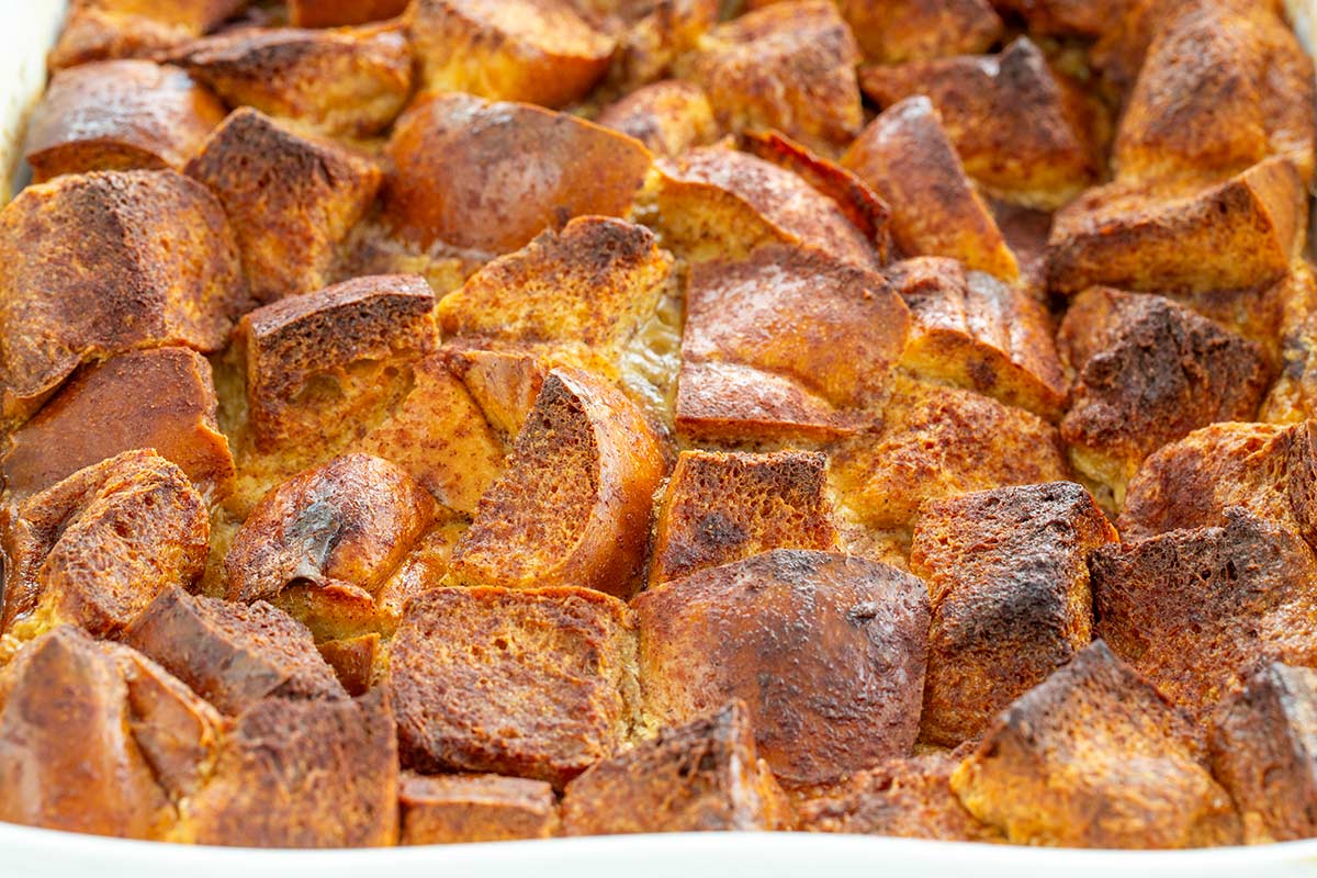 - Bake – Set the oven rack to the center position and heat to 350ºF (177ºC). Place the casserole dish on a large sheet pan. Sprinkle on the cinnamon and sugar topping. Bake until the custard is set, puffed up, and reaches an internal temperature of 175 to 190ºF (79 to 88ºC) on an instant-read thermometer, about 50 to 60 minutes. If the bread starts to brown too quickly, loosely cover the top with foil after about 45 minutes of baking.