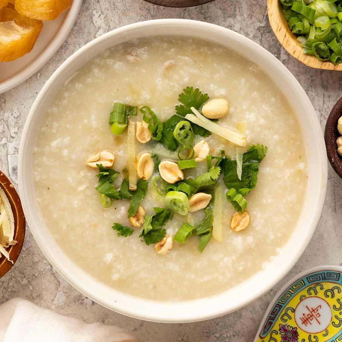 - To Serve – Portion the hot congee into bowls. Add desired toppings like sliced green onions, cilantro, peanuts, oyster sauce, chopped eggs, thinly sliced ginger, chili oil, chili crunch, or Chinese donuts.