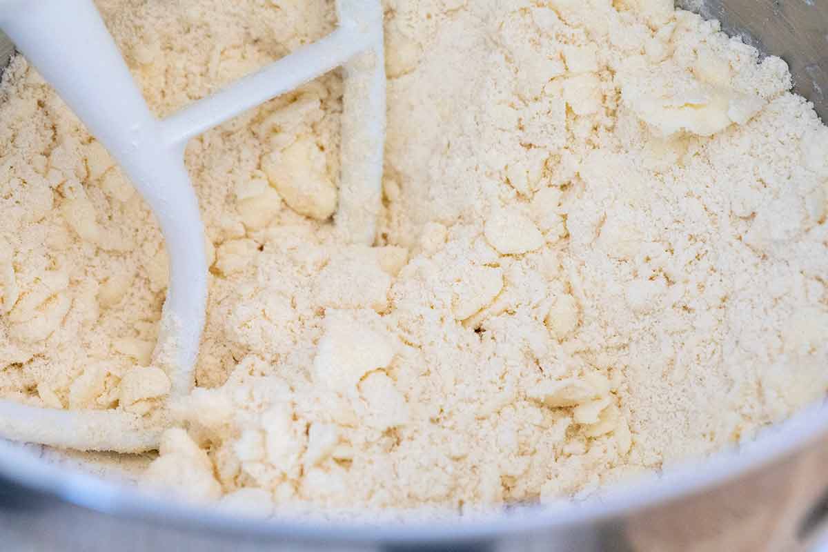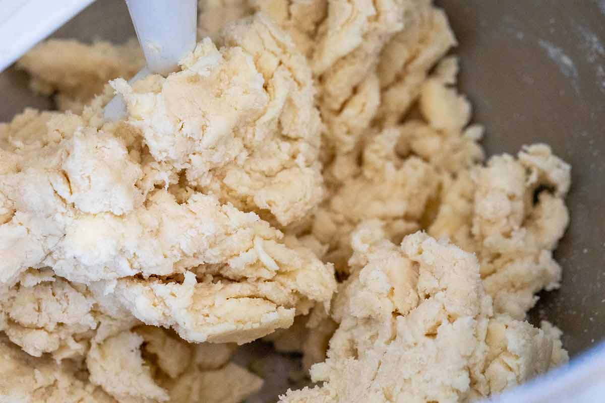 My dough has a higher butter ratio, which reduces gluten formation, resulting in a light, flaky crust. My stand mixer swiftly breaks down the fat into pea-sized pieces in less than two minutes compared to using your fingers. A dough cutter works well, too.