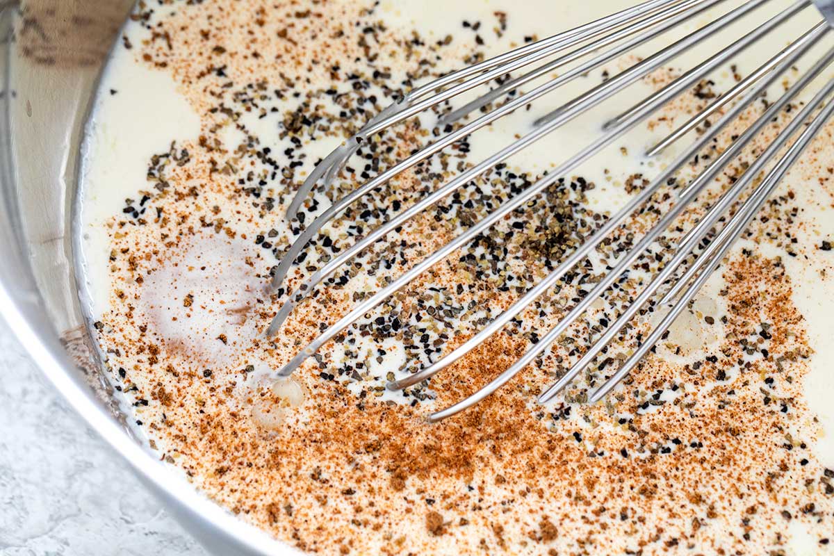 For every cup of dairy, you need 2 eggs. The albumin proteins help solidify the liquid egg mixture. However, for a creamier consistency, I use 3 whole eggs and 1 egg yolk. The quiche is seasoned with salt, pepper, and a hint of nutmeg. Pour the mixture into the shell.