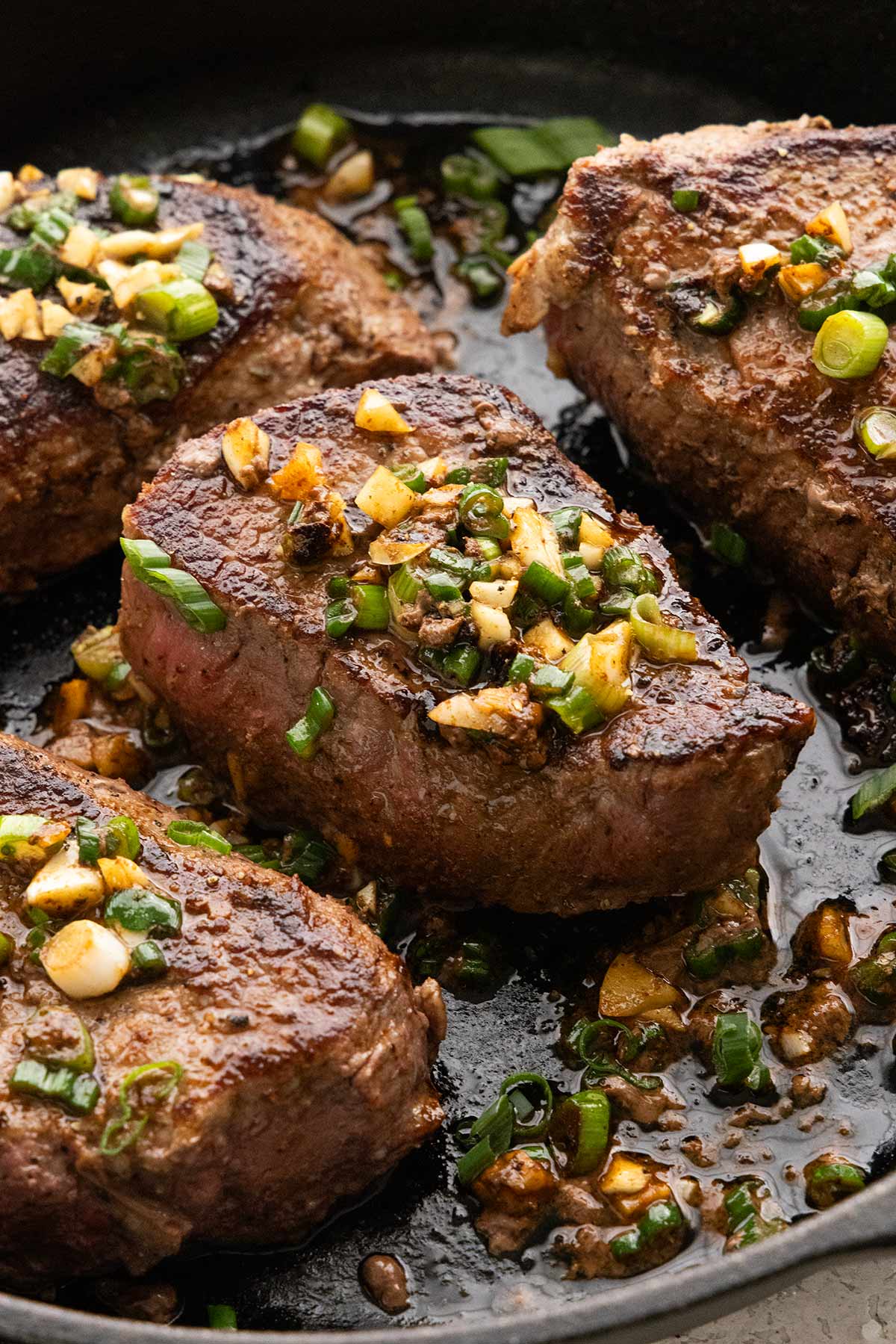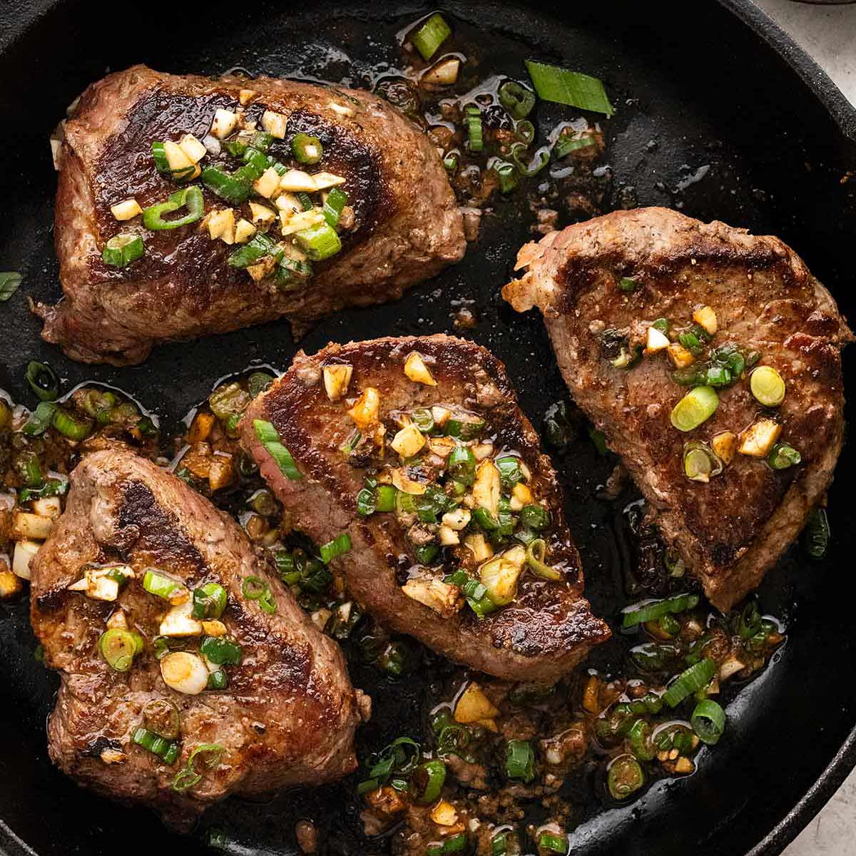 - Baste the Steaks – Reduce the heat to medium-low. Add the butter, minced garlic, and green onions to the center of the pan. Saute until fragrant, about 30 seconds. Tilt the pan and use a spoon to baste the steaks with the mixture briefly.