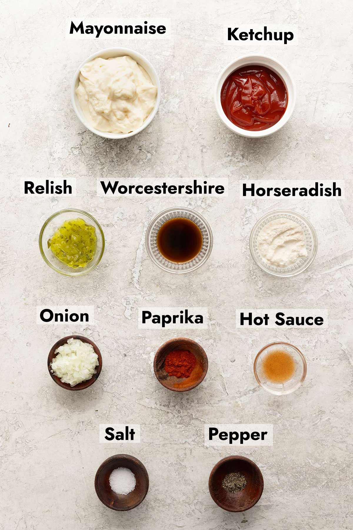 - Make the Dressing – In a medium bowl, whisk together mayonnaise, ketchup, onion, horseradish, relish (if using), Worcestershire sauce, hot sauce (if using), paprika, salt, and black pepper. Cover and refrigerate until ready to use.