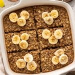To Serve - Slice the warm banana baked oatmeal. Serve as is or with desired toppings.