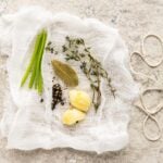 Alternatives to Cheese Cloth: Place the herbs and spices in a tea or coffee filter or tea infuser. Create a bouquet garni by wrapping the herbs in celery stalks and tying the bundle with kitchen twine. Alternatively, add everything directly to the pot if the stock or broth will be strained before using.