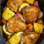 Add Vegetables - To a 6-quart slow cooker, add onions, carrots, potatoes, corn, and garlic. Add the seared chicken on top of the vegetables, plus thyme, and rosemary.