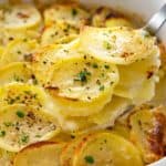 Layer the Potato Slices - Wash and peel the potatoes and cut them into ¼" thick slices. Arrange a third of them in overlapping rows, about four rows in the casserole dish. Whisk and then evenly pour a third of the cream mixture over the top.Repeat two more times with the remaining potatoes. Cut 1 tablespoon of butter into small cubes and arrange them evenly on top.